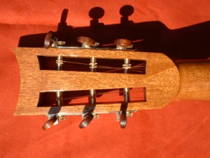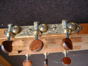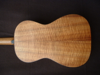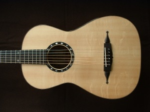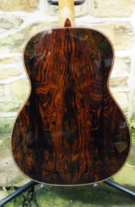 Recently, responding to a request for a smaller parlour style of steel string guitar, I built a model based on the 19C guitars made by Panormo. Made in the Panormo style but with cross strutting, the body is made from Koa and the soundboard of Alpine spruce. A relatively short scale length of 630mm makes the guitar very easy to play and it has a sweet, full tone and looks very pretty.